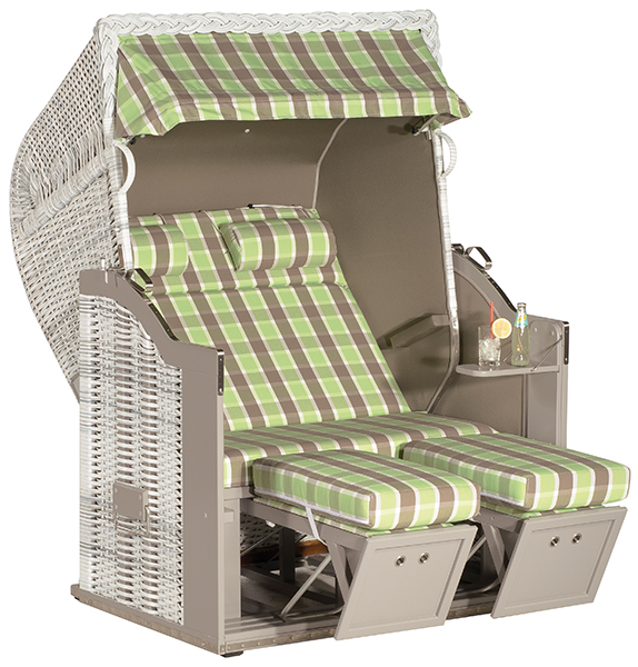 Halbliegemodell, Zweisitzer, Kunst stoffgeflecht white-washed, Vario-Polsterung: Stoff-Dessin: Jacapo, Innenstoff: uni taupe, Extras: 2 Nackenrollen, 2 Fußkissen, PE-Gleiter, Höhenverstellung der Fußstützen, Sichthölzer taupe lackiert